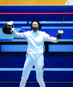 8月4日,中国队选手孙玉洁庆祝胜利。当日,在伦敦奥运会女子重剑团体四分之一决赛中,中国队以45比42战胜德国队,进入四强。