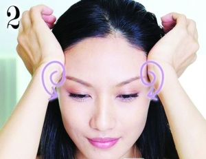 用双手手掌根部,压在太阳穴,以旋转方式轻压按摩约5-8下,帮助头部放松,并促进血液循环。