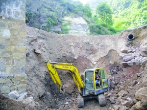 今年6月26日,省道S231线野竹坪镇老寨段公路、涵洞被山洪冲毁,垮塌长20米、高12米、宽10米,造成交通完全中断,野竹坪镇紧急抢通临时道路保障车辆绕道通行。7月上旬,该县筹资80万元,组织施工队进场修复,截至目前,完成工程量的55%,预计9月中旬竣工通车。图为8月17日,挖土机清理塌方泥石。