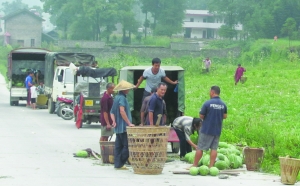 保靖县野竹坪镇平均海拔700米,具有种植高山西瓜独特的地理环境和气候优势,栽种的西瓜个儿大、肉质甜、水分多、品质好。今年,该镇通过推进土地流转、扶持大户规模种植西瓜2035亩,按每亩采摘1900公斤、每公斤收购价格1.6元计算,产值达618万元。图为外地瓜商收购杰坳村种植大户秦齐平西瓜场景。