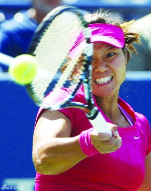 8月31日,李娜在比赛中回球。当日,美网女单继续展开争夺,中国选手李娜迎来罗布森的挑战,经过三盘苦战,李娜最终以4比6、7比6、2比6不敌小将罗布森,无缘16强。