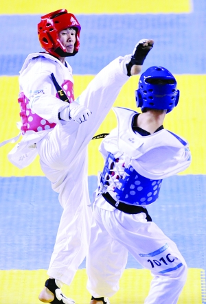 当日,在天津举行的第九届全国大学生运动会跆拳道男子54公斤以下级比赛中,新疆队选手郭文强以3比2战胜天津队选手田帅,获得冠军。