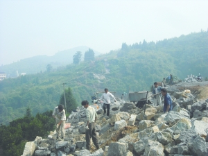 9月19日上午,省道S306石堤至永顺公路加宽改造现场———吊井岩灵溪大桥在建工地,路桥公司的员工正在砌岩石夯路基。石永公路,是湘北地区重要的经济干线,全长36.896公里,全线采用二级公路的技术标准建设。新建的吊井岩大桥是该公路上最长的一座大桥,长300米,高85米,拟于2014年建成。图为遥相呼应正在建设的大桥两端施工现场。
