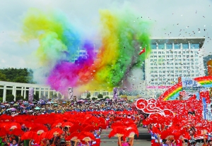 本报讯(记者 彭 宁 龙 莹)9月22日,庆祝吉首市建市30周年群众游行活动在吉首市市政大楼前坪世纪大道举行。由9辆宣传彩车和3000名各族市民群众代表组成的游行方阵依次沿世纪大道由北向南行进,通过游行全面总结和宣传吉首市建市30年来经济建设、社会发展、生态建设和民族团结等各方面取得的巨大成就。 游行活动历时约90分钟,分为“热土吉首、品牌吉首、多彩吉首、欢乐吉首”四大版块。由各行各业干部职工、中小学生和市民代表组成的国旗鲜花方阵、民族盛装方阵、苗鼓方阵、接龙舞方阵、旅游形象方阵、极限运动方阵、乾州扎春方阵、傩面舞方阵、调年舞方阵、花灯曲艺方阵、狮子祈福方阵、四龙贺喜方阵、少年鼓乐队、活力城市方阵、苗族绝技方阵、欢乐城市方阵依次沿世纪大道行进,全面展示吉首市民族民间风俗和各行业建设成就。 9辆主题鲜明、设计精巧的彩车穿插在游行方阵中,分别以“先行先试”、“民族自治”“扶贫攻坚”、“农业发展”、“新型工业”、“城市品牌”、“标志性景点”、“非遗文化展”和“谷韵吉首”为主题,多角度多形式展现吉首发展中享受的优惠政策,经济建设取得的成就,城市品牌建设、生态保护和文化旅游等方面取得长足发展。 |