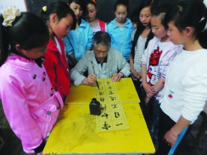 9月23日,肖仕鑫老师在为永顺县松柏中学学生作书画示范。肖仕鑫今年70岁,是永顺县唯一一位农民身份的县诗词理事,今秋开学,当他得知松柏中学缺少书画老师,书画课无法开课时,就主动担起了该校书画老师,每周两节课,不收分文报酬,获得乡亲们和师生的好评。