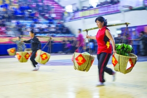 9月26日,在龙山县举办的农民趣味运动会上,参加男女混合挑担子迎面接力赛的村民在赛场上猛冲终点。