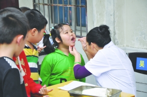 本次体检的医务人员来自吉首市镇溪社区卫生服务中心,体检内容包括身高、体重、视力、眼科、口腔等多个项目。体检结束后,卫生服务中心将把这次体检中发现的健康问题及时反馈给家长,让家长能够及时帮助学生矫治、消除影响健康的不良因素,确保学生安全、健康地成长。图为医务工作者在给学生进行口腔卫生检查。 通讯员 陈先福 摄