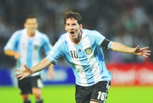 10月13日,阿根廷队球员梅西庆祝进球。当日,在阿根廷门多萨市马尔维纳斯体育场举行的2014年世界杯南美区预选赛上,阿根廷队主场以3比0战胜乌拉圭。