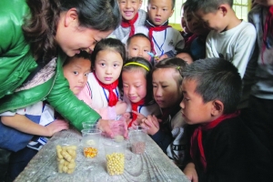 10月16日,是第32个世界粮食日,泸溪县合水镇小学三年级2班的黄萍玉老师在科技课上指导学生辨认各种粮食种子,教育孩子们从小认识粮食、节约粮食。