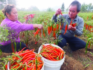 10月30日,永顺县松柏镇坝溶村民刘德松夫妇在摘反季辣椒,准备到镇上赶场销售。