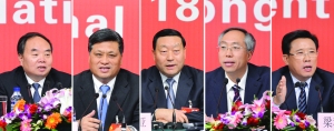11月10日,党的十八大新闻中心举办主题为“实施创新驱动战略 加快转型发展步伐”的集体采访活动,中国工程院院长、党组书记周济,中国航天科技集团公司总经理、党组书记马兴瑞,国家电网公司总经理、党组书记刘振亚,天津天地伟业数码科技有限公司总经理、党委书记戴林,三一重工股份有限公司董事长梁稳根(从左至右)接受媒体采访。