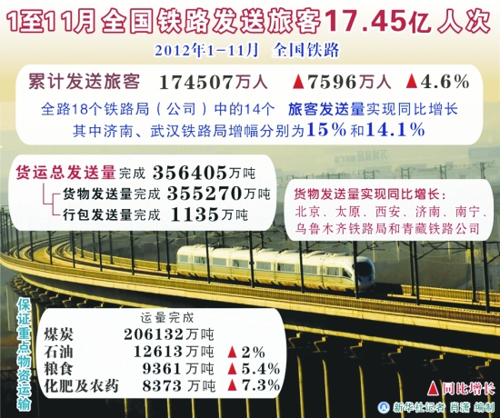 新华社图表,北京,2012年12月7日 图表:1至11月全国铁路发送旅客17.45亿人次 新华社记者 肖 潇 编制