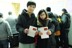 2013年1月4日,因为谐音“爱你一生一世”,众多新人选择在当日结婚登记。记者从吉首市民政局婚姻登记处了解到,截至当天16点40分,该登记处一共登记了186对新人,而前一个工作日仅为20余对。图为刚领证的一对新人。