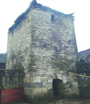 “啊!”当一座堡垒式的建筑赫然出现在我们眼前时,我们情不自禁地发出了惊愕的叫声,这就是寨堡啦!这寨堡,全部用青石块垒成,上面有一些瞭望孔或是枪眼。阴沉的天气,使得这寨堡的青石泛着一层神秘的幽光,也更让人感觉到了一种岁月的沧桑。这样的寨堡,在齐心村有3处。
