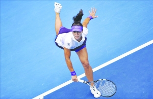 1月18日,中国选手李娜在比赛中发球。
