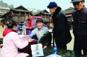 1月26日,永顺县组织文化、科技、卫生等部门,来到芙蓉镇,集中开展送政策理论、送文化、送科技、送卫生、送法律春节“五下乡”活动。热闹的活动现场,县文联的书法家协会会员挥毫泼墨,免费为群众书写一幅幅喜庆春联,县文化馆演员们还演出了精彩的文艺节目。法律政策、文化、科技、卫生计生、理论等12个服务台前,都围满了来咨询和观看的群众。图为医生为群众测量血压。 向水生 摄
