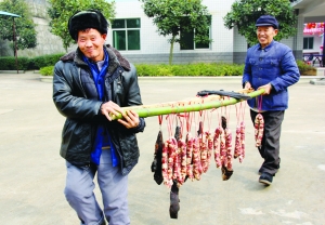 1月24日,花垣县福利院里,热闹非凡,暖意浓浓。当天,该县的爱心女士向吉英给福利院送来了价值3万元的腊肉、香肠、床上用品毛绒“四件套”等物质和现金。还有乡镇文化队、边城爱心协会义工也参加了送温暖活动。 图为老人搬着刚刚送来的香肠和腊肉,高兴极了。