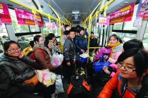 当日,合肥春运公交专线正式开始运营。据了解,为方便大学生和农民工顺利回家过春节,合肥公交公司在2013年春运期间开通“预约临时直达公交专线”,服务时间为1月26日至2月8日。合肥公交集团的工作人员告诉记者,只要在合肥市内同一地点或附近区域,且同一时间有30人以上集体出行至合肥汽车站、客运总站、旅游汽车站、火车站四个客流集散枢纽站的返乡农民工或高校学生,都可拨打合肥公交集团服务热线提前一天进行预约。