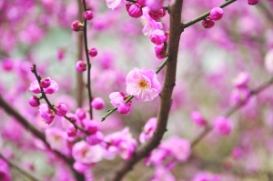 喜欢桃花开,因为桃花意味着秋日的收获,也因为如红云般悬在树上的桃花,可以满足乡下女孩对于美的向往。二月冻桃花。春寒料峭的时候,桃树褐色的枝条上冒出小米一样的红点,鼓胀胀地一天天膨大,天气稍一暖和,就争先绽开了。桃花的瓣儿薄如纸翼,是浅浅的粉色,有些不胜春风的娇弱。只有无数朵花挤在一起,才有繁华的气象,引得蜜蜂嗡嗡地忙个不停。一夜春雨,一阵春风,尖尖瘦瘦的花瓣就簌簌地下落,洒在白菜叶子上,铺在泥地上。我爱拿着针线走进菜园,拣整齐的花瓣穿起来,一串串戴在脖子上、手腕上、头上。一次,我正装扮得像个花仙子般自我陶醉的时候,被爷爷喝住了:“一个女孩子家这么‘秋’(秋,湘西话,即爱美爱到炫耀的地步),长大怎么了得!”