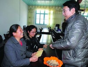 在春节回北京述职前夕,张昭拿出自己一年来的3600元生活补助金,全部捐给了西米村2户贫困家庭。此次,张昭还送来价值上万元的高清投影仪和功放音响设备一套,以解决西米村农民文化生活和村支“两委”办公设备欠缺的问题。他还专门请来技术员将捐赠设备安装调试到位。图为张昭给帮扶群众送上慰问金。 黄怀东 摄