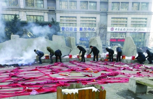 2月16日,在辽宁省沈阳市奉天银座广场,一家企业的员工在燃放“开门炮”。 当日是春节长假后上班第一天,人们有在这天一大早燃放“开门炮”的习俗,期盼在新的一年里生意、事业红红火火。但过量燃放“开门炮”带来大量鞭炮碎屑,给环卫工人增加了劳动强度,对周边环境也造成一定程度的污染。 新华社 赵敬东 摄