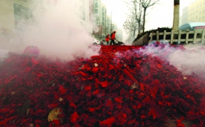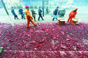 2月16日,环卫工人在河南省许昌市街头清扫“开门炮”燃放后的垃圾。 新华社 牛书培 摄
