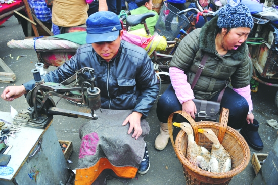 赶场时,一些赶集人把平时用坏了的鞋、锅送来修补。