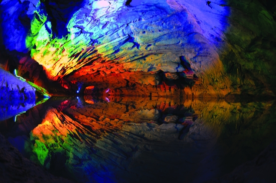 灯光点缀下的暗河宁静、迷人,一滴水从洞顶落下,镜面一样的水面涟漪荡开。