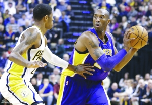 3月16日,湖人队队员科比在比赛中寻找队友传球。当日,洛杉矶湖人客场以99比93击败东部第二的印第安纳步行者。科比因伤只打首节,但湖人众志成城,保住西部第八的位置。霍华德拿下20分12篮板,慈世平19分7篮板3助攻,纳什15分9助攻,替补布雷克18分7助攻4篮板,贾米森17分7篮板,湖人全队三分球26投13中。