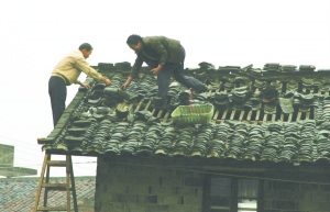 3月23日,江西省靖安县双溪镇双溪村村民在修补房顶。