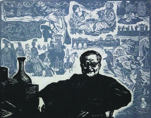 二十年后再次邂逅,画里不仅仅是沈从文像,还有沈从文作品。田茂军老师说:“这幅画是刘鸿洲先生的木刻代表作,前景人物与背景的处理相得益彰,紧扣人物创作与研究主题,丰富的意象与人物的传神表情前后套印,静穆,大气,蕴藉。”