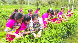 3月21日,保靖县水田河镇中心村种茶大户向远平的200亩黄金茶园里,几十名苗家学生和老师与苗家阿婆阿姐一起采摘“清明茶”。