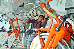 3月30日,工作人员在公共自行车亭进行调试。