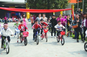 4月8日,州幼儿园召开首届春季趣味运动会。图为大班比赛项目———自行车越野赛。