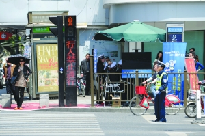 4月13日,在杭州市保俶路与曙光路口,由摄像机和大屏幕组成的曝光台架设在路边用于对行人和非机动车的不文明行为进行现场曝光。 继在3月份开始对行人和非机动车等“中国式过马路”行为进行处罚之后,近日,杭州市交警部门又推出了“摄像机加大屏幕”的整治措施,通过摄像机对行人和非机动车的不文明行为进行实时摄像,并将画面传输到一边的显示屏上进行现场曝光。 据交警部门介绍,这套设备现在还处在试运行阶段,未来几天交警部门将在十条重点整治道路的路口架设这样的摄像设备,如有行人和非机动车违法,都可以在现场大屏幕上予以曝光。 新华社记者 鞠焕宗 摄 |