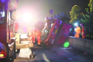 本报讯(通讯员 黄 忠 邓伟星)4月11日凌晨2时30分, 凤凰县消防大队接到报警:二级公路凤凰县民族体育中心路段,一辆满载黄磷的槽罐车在转弯处发生侧翻,三人被困情况危急,请求救援。接到报警后,凤凰大队火速赶往现场。 凌晨2时35分,大队官兵到达现场,针对现场情况,立即按照槽罐车事故处置方法进行了现场警戒。经勘察了解,此车车牌为贵A-48996,装有32吨黄磷,行至转弯处时由于刹车失灵,槽罐翻到在马路护栏外,车头侧翻在护栏上,驾驶员被方向盘卡住大腿,无法动弹,另外两名驾驶室内人员在路过的一位出租车司机的帮助下被救出,无大碍。 消防官兵在经过勘察以及有关技术人员对罐体进行鉴定,确定槽罐体无泄漏后,指挥员派专人负责看护罐体,一经发现泄漏立即发出信号。随后消防官兵对驾驶室进行了仔细勘察,首先利用液压扩张器对驾驶室进行扩张,但是发现变形的驾驶室空间太小无法实施扩张,于是指挥员立即调整救援方案,在现场交警、公安以及技术人员的配合下,利用紧急征调来的吊车慢慢将罐体提起,并移向马路中间,此时救援空间增大了,消防官兵立即利用液压剪、扩张器等救援工具, 4时,被困驾驶员被成功救出,并送往医院检查。 据了解,此次事故无人员伤亡,3名受伤人员均为轻伤。 |