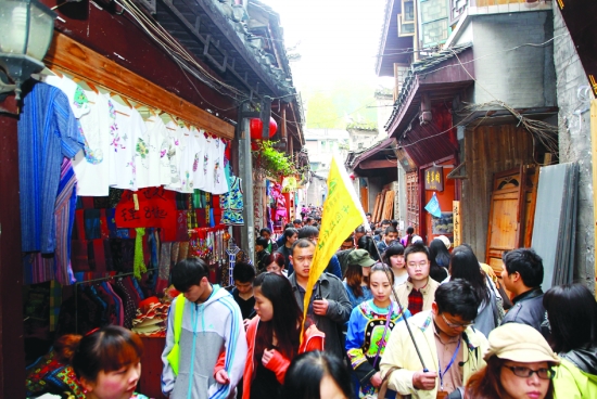 4月13日是实施了古城门票收费的新规来的第一个周末,古城“核心区”游客秩序井然。据凤凰古城旅游公司介绍,截至晚上6时,当天共出售门票5016张。 本报记者 彭 伟 摄