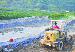 永顺县灵溪镇富坪河道整治即将竣工。届时,该工程对于灵溪镇西部地区的防洪灌溉起到很好的作用。图为施工人员正在用推土机推土保护新砌河堤。