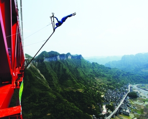 4月27日,挪威平衡大师埃斯基尔在矮寨大桥的观光通道上,进行徒手倒立、叠凳子、滚筒上挑战平衡等表演,整个过程埃斯基尔都不采取任何保护措施。 湘渝高速的重要连接工程、世界桥梁奇迹、创造了“四个世界第一“的矮寨大桥,于2012年3月31日建成通车,2012年9月15日,新疆高空王子阿迪力携两位徒弟,在矮寨大桥一侧进行了一根钢丝三人对走的惊天挑战;2012年9月16日,来自中国、美国、英国、法国等世界各地的跳伞运动员,在矮寨大桥进行了低空跳伞挑战。一时间,矮寨大桥成为全球极限运动爱好者征战的圣地。 张 谨 龙清彰 周玮玮 楚 江 摄 (详情请见二版) |