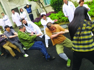 4月23日上午,州荣复医院的医护人员组织该院的部分住院病人进行了一场拔河比赛,医护人员纷纷为自己的病人加油。据了解,州荣复医院经常通过举行各种形式的活动,让病人多参与集体活动,使他们能尽快康复回归社会,也让医患关系更融洽亲近。