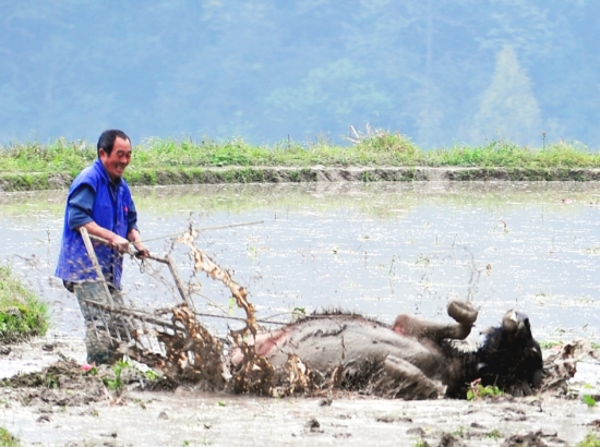 牛耕累了,皮肤痒 ,在水田里玩起了牛打滚。