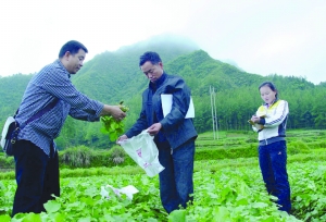 5月9日下午,在海拔千米的龙山县茨岩塘镇茨岩村绿色无公害蔬菜基地,龙山县农产品质量安全检验检测站的女技术员,与当地的镇、村两级蔬菜安全检测员一道,对处于生长期的优质萝卜现场抽样,准备利用精密仪器进行安全指标检测。