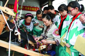 5月16日,州非物质文化遗产传承人黎承菊,正在给一群小学生传授织锦技艺。为了更好地保护和传承土家族文化,龙山县城区学校,定期带学生到土家织锦传习所开展学习实践活动。