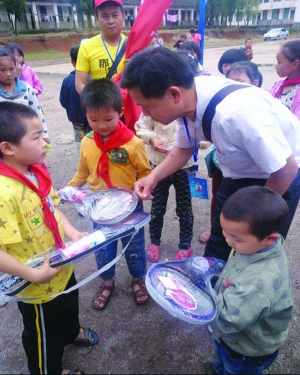 5月30日,保靖县一名义工为该县迁陵镇要坝小学学生赠送礼物。为更好的关爱贫困学生,在“六一”儿童节到来之际,边城爱心志愿者协会保靖分站的志愿者精心筹备了30副、价值2000余元的羽毛球拍等学习、体育用品作为节日礼物,送到了该县30名贫困学生手中。