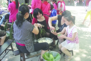 6月5日,端午节来临之际,龙山县华塘小学组织“爱在校园里”包粽子活动,以关爱学生健康快乐成长为出发点,让全校师生都行动起来,快快乐乐过端午,开开心心吃粽子。图为老师在教学生包粽子。