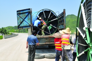 6月3日,张花高速保靖段花井村路段,工人们正在齐心协力把一个个巨型光缆线圈从车上卸下来,推到路中的预埋地点。工人师傅介绍,张花高速进入路面硬化、全面绿化阶段,这些光缆要先进行预埋,主要用于通车后的监控。