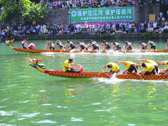 6月11日,凤凰县2013年龙舟赛拉开帷幕。当天,沱江河热闹非凡,共有环保协会宣传队、政府战线队等13支队伍参与角逐。“保护沱江河,保护母亲河。”彰显着队员们保护环境、热爱家园的环保意识。 万姿含 摄