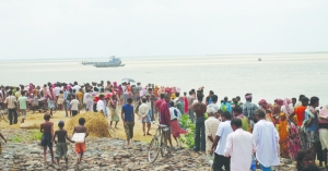 6月14日,在印度东北部西孟加拉邦马尔达地区,人们聚集在发生沉船事故的水域岸边。