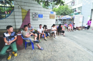 6月15日清晨,家长在柳州市谷埠路幼儿园门口排队,不少家长已经排了一整夜。
