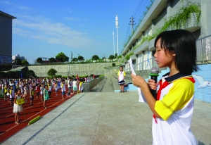 7月4日,吉首市八小在散学典礼上表彰本学期取得优异成绩的优先学生和优先学生干部,并向学生发放《2013年春暑假学生安全文明承诺书》,要求每个学生逐条落实到位。图为学生代表宣誓仪式现场。